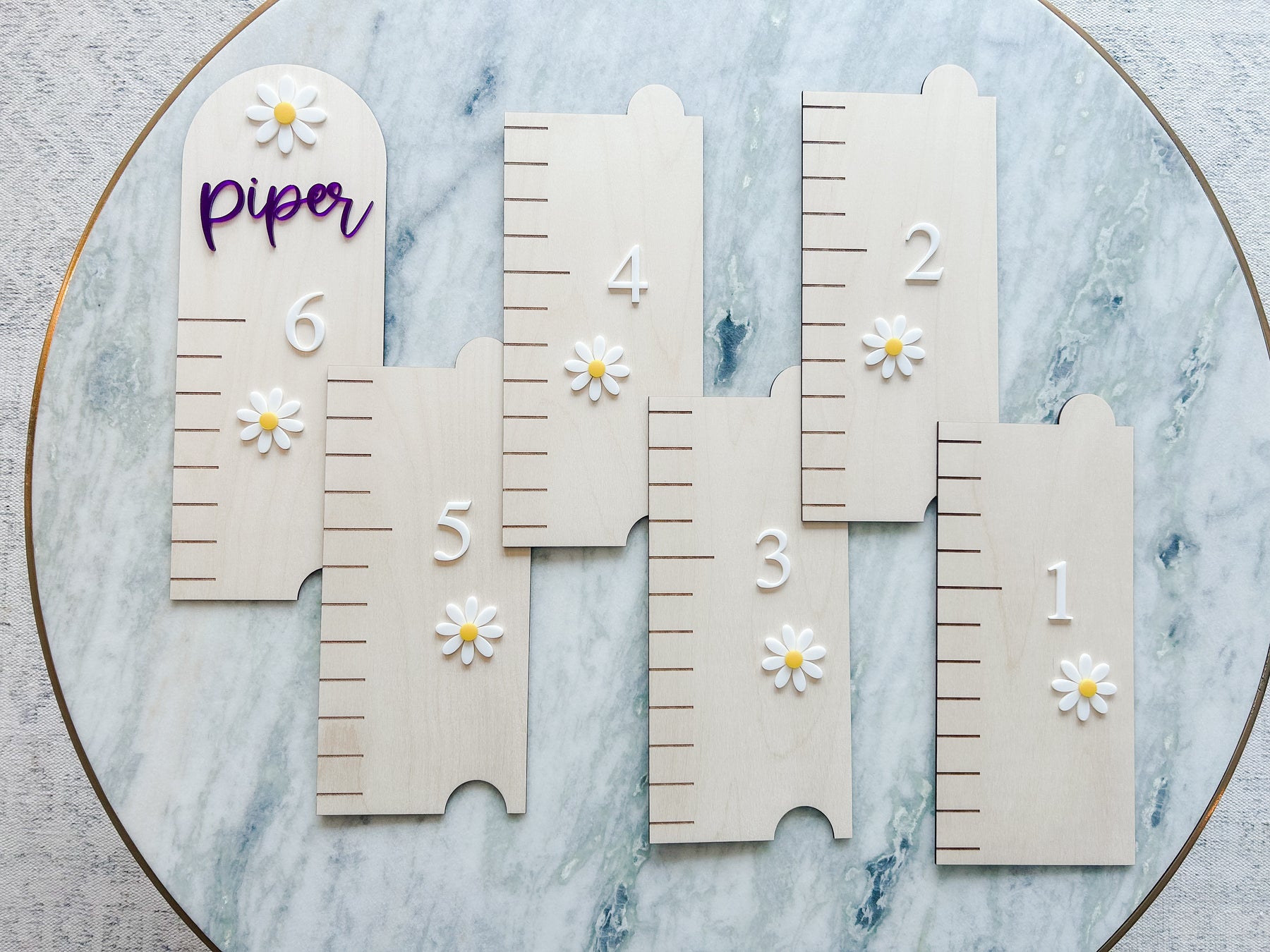 Watch your little one grow with our beautiful Personalized Growth Chart – the sweetest way to capture their milestones year after year. Made from smooth, natural wood and accented with cheerful acrylic daisies and a custom name at the top, this chart is both a keepsake and a lovely piece of room décor.
