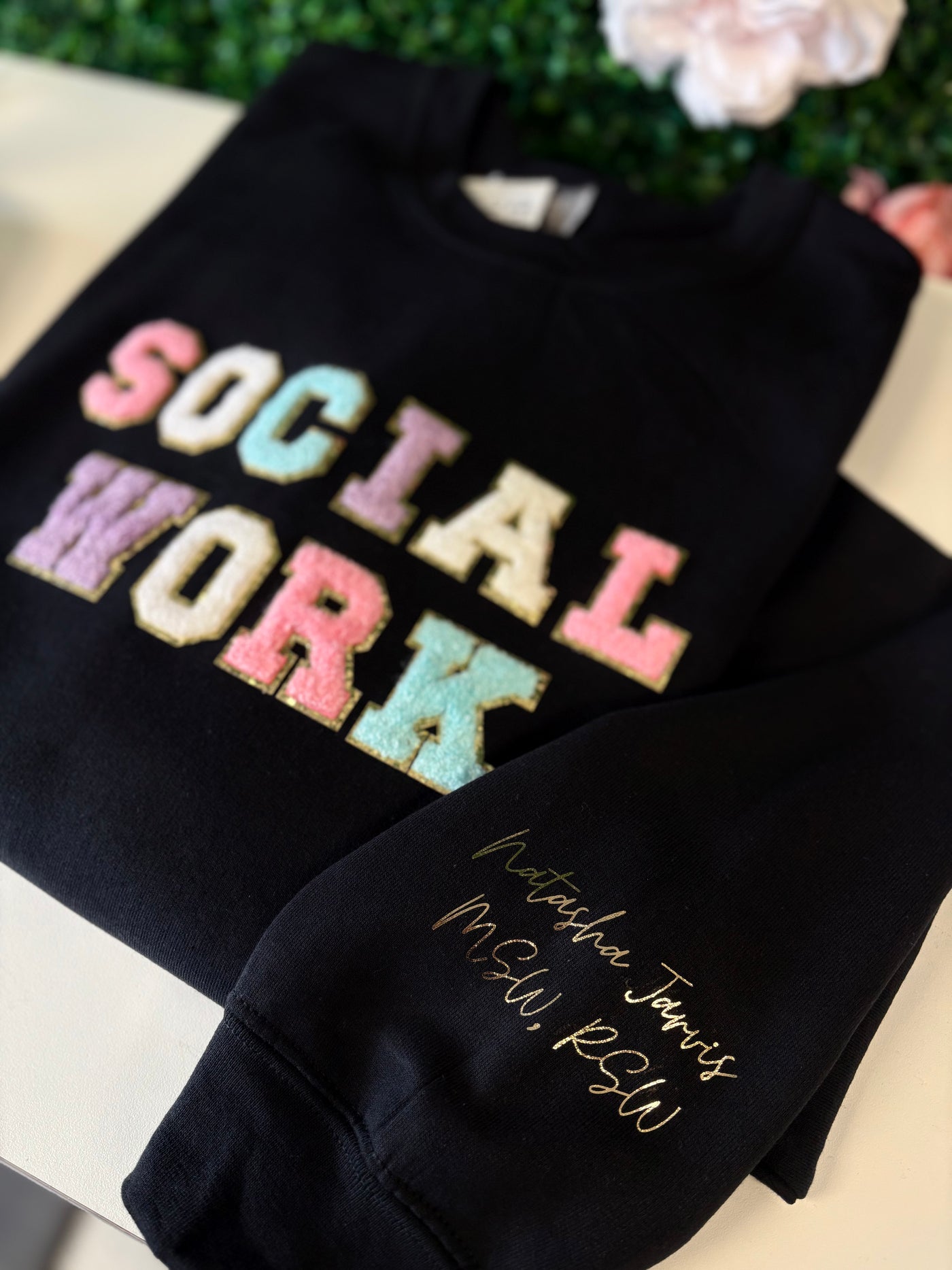 Our SOCIAL WORK Chenille Patch Crew is the perfect piece for your wardrobe. With an intricate patch design, this piece will add a fun accent to any ensemble. Colour of each letter may vary per garment.
